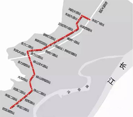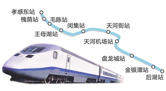机场线由金银潭至天河机场,预计2016年年底通车。全长19.5公里,设站7座,分别为天河机场站、航空总部站、宋家岗站、巨龙大道站、盘龙城站、宏图大道站、常青城站。